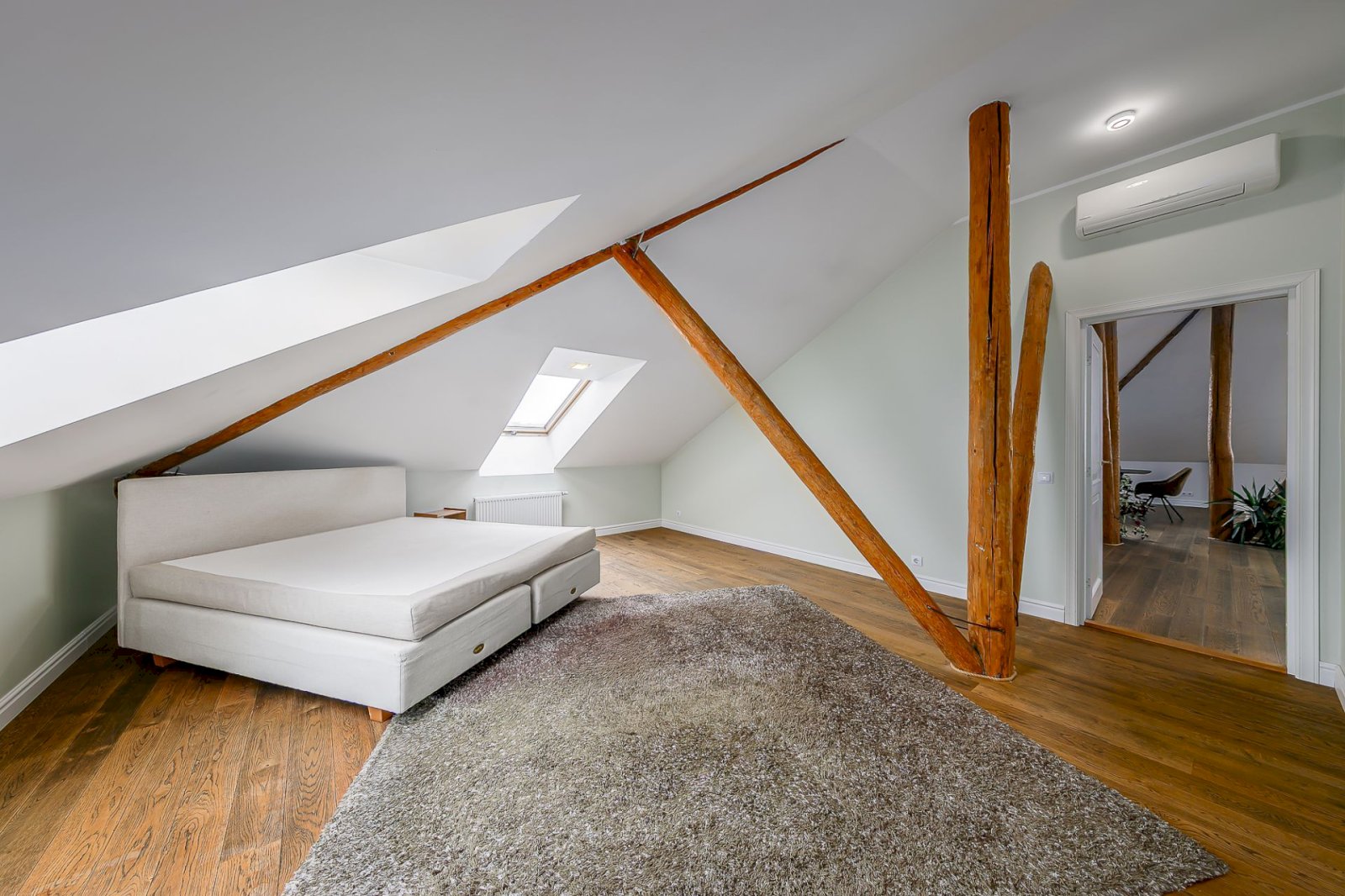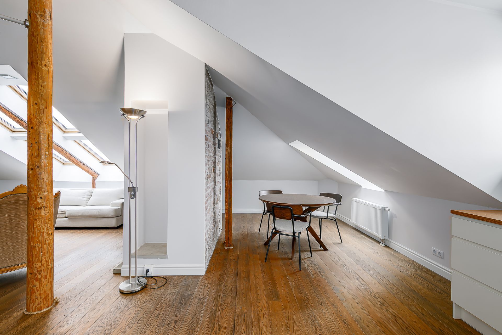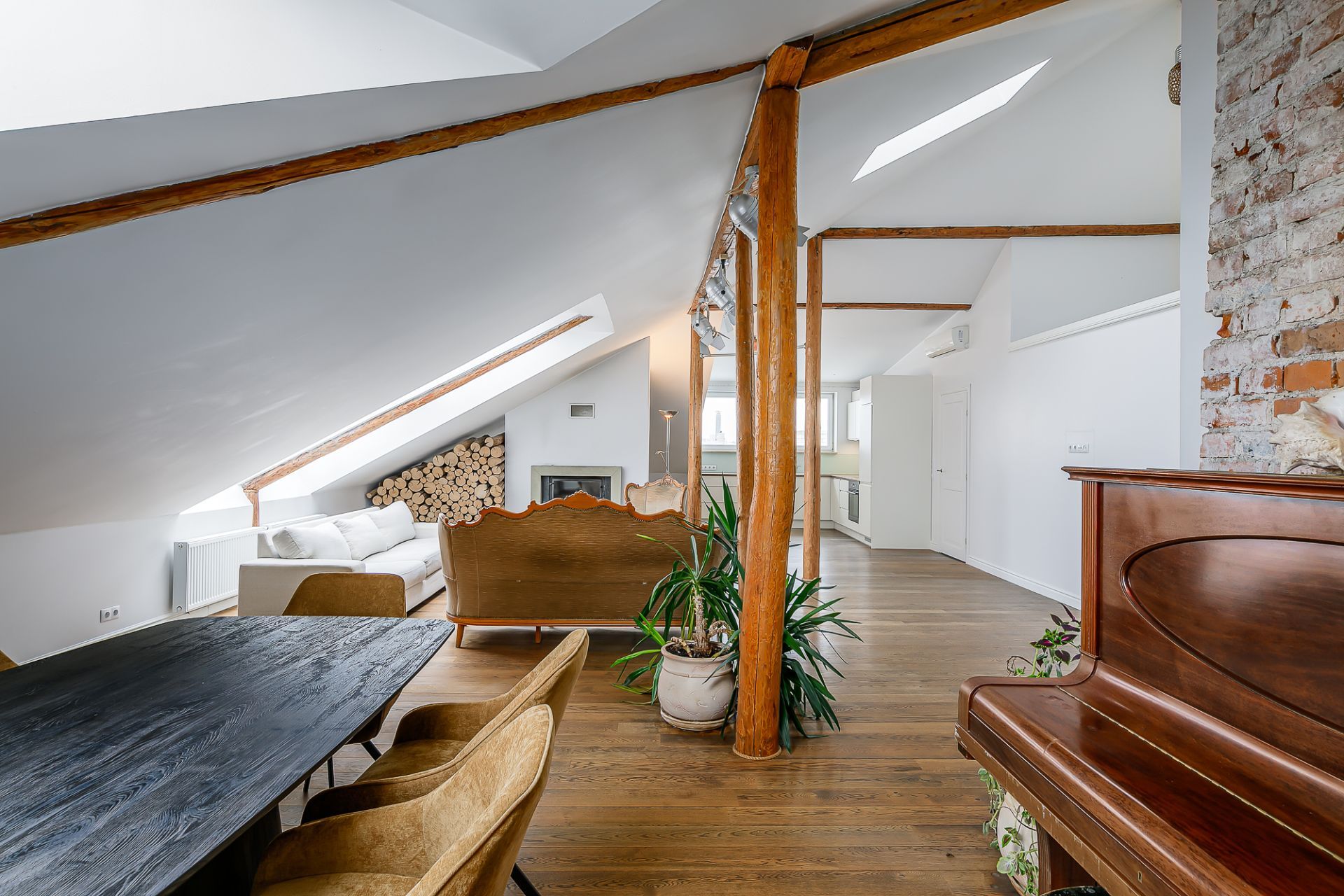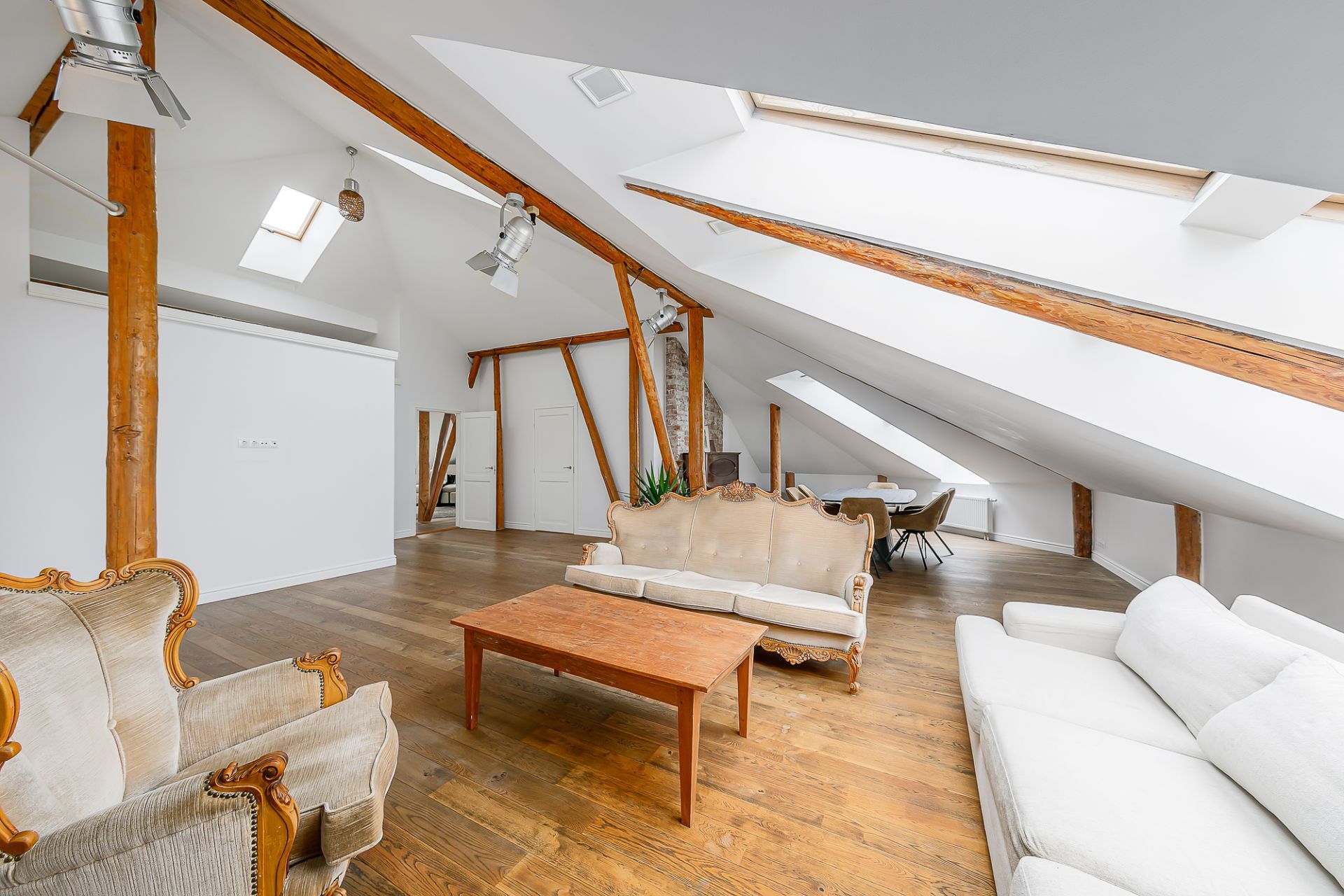 Light tones and natural materials, the wooden beams from the construction period have been preserved, which create a cozy and warm atmosphere. The floors are covered with natural parquet, natural stone in the bathroom, and granite tiles in the hallway.