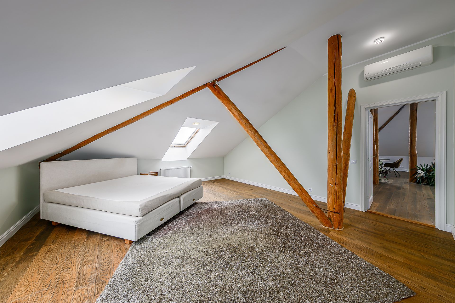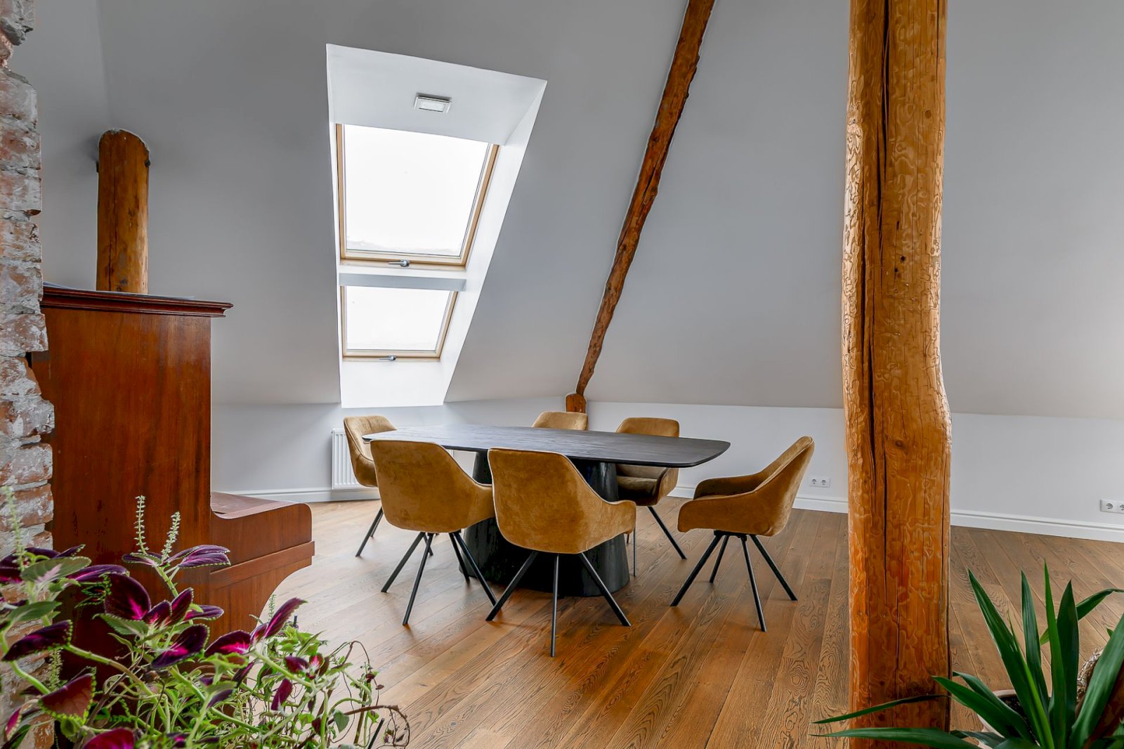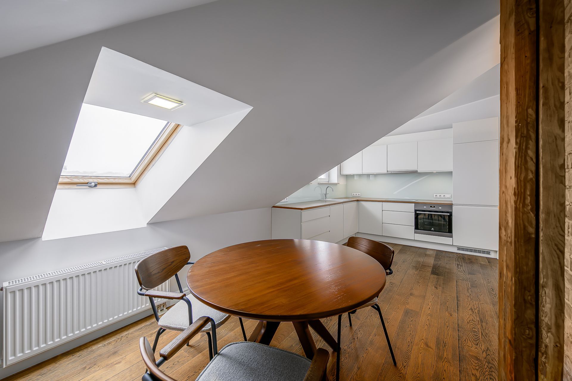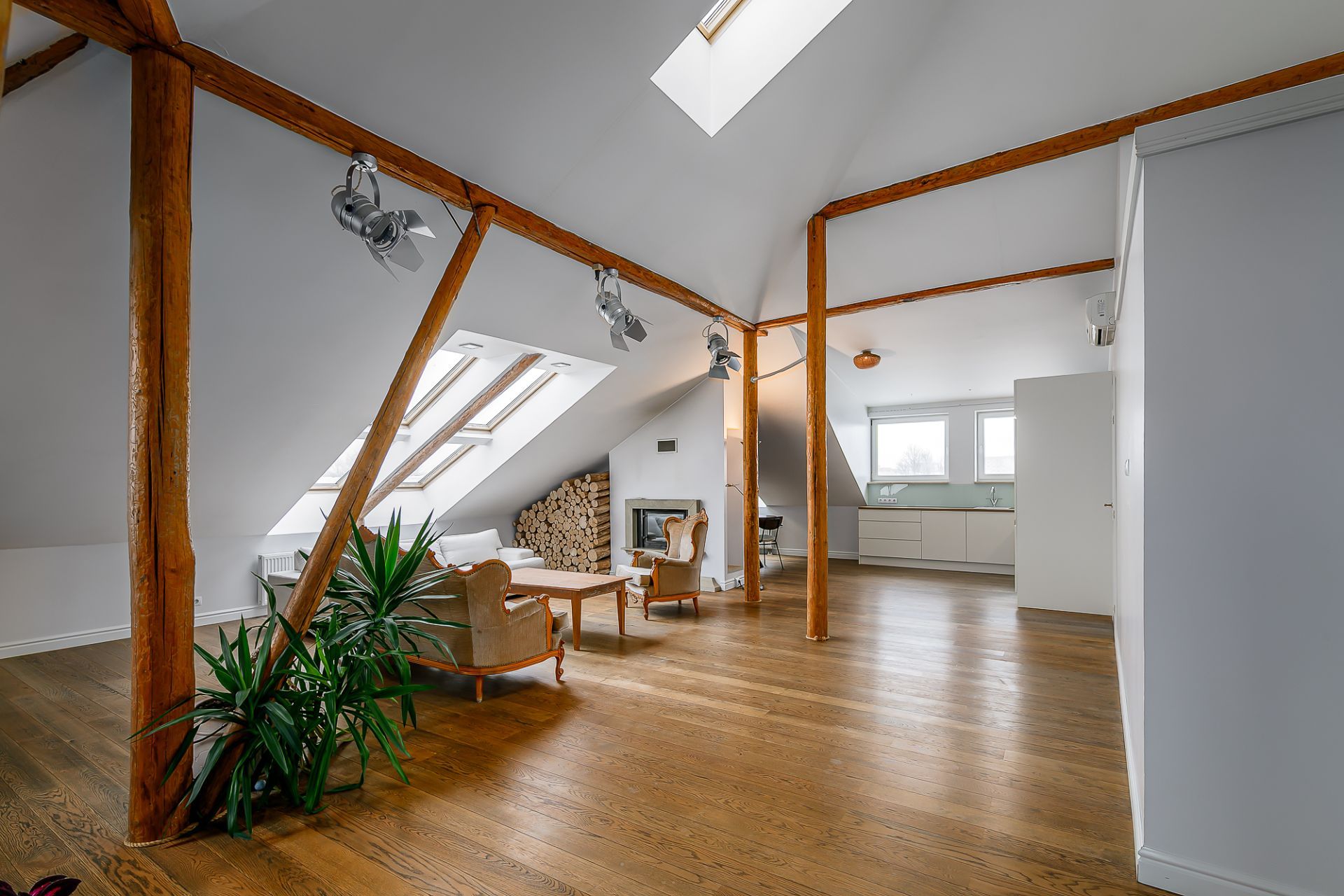 Light tones and natural materials, the wooden beams from the construction period have been preserved, which create a cozy and warm atmosphere. The floors are covered with natural parquet, natural stone in the bathroom, and granite tiles in the hallway.