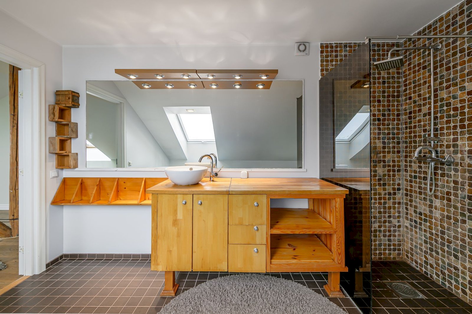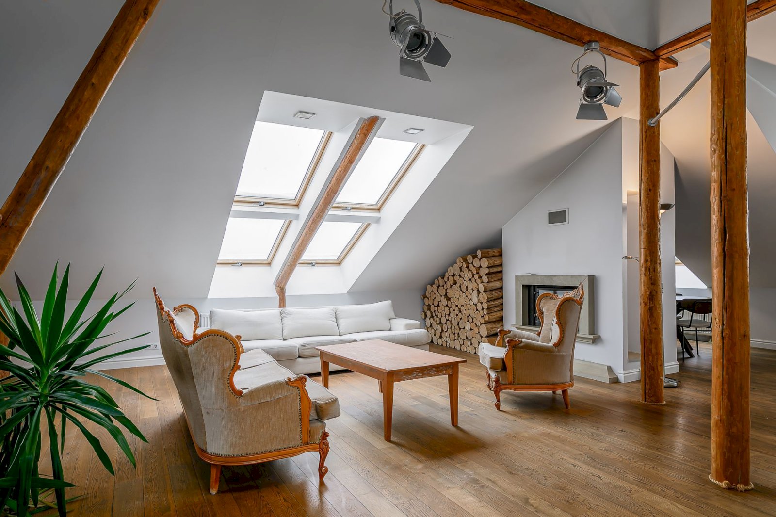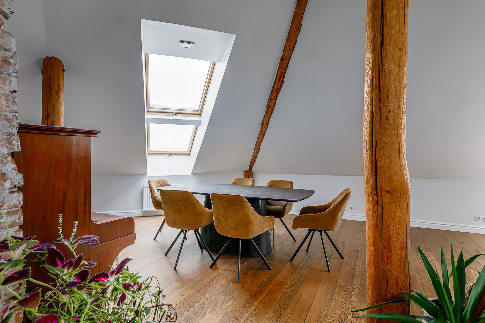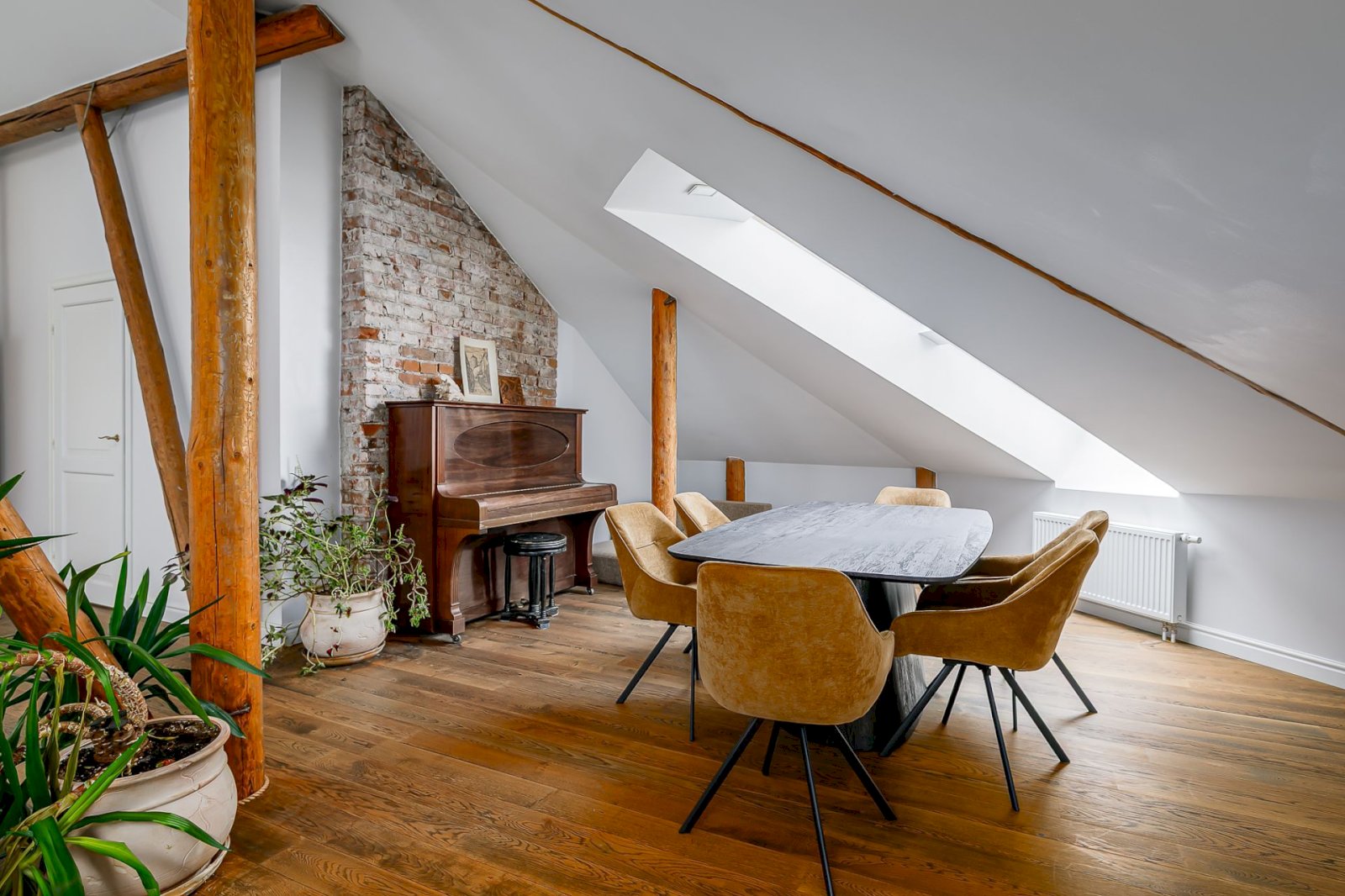 Light tones and natural materials, the wooden beams from the construction period have been preserved, which create a cozy and warm atmosphere. The floors are covered with natural parquet, natural stone in the bathroom, and granite tiles in the hallway.