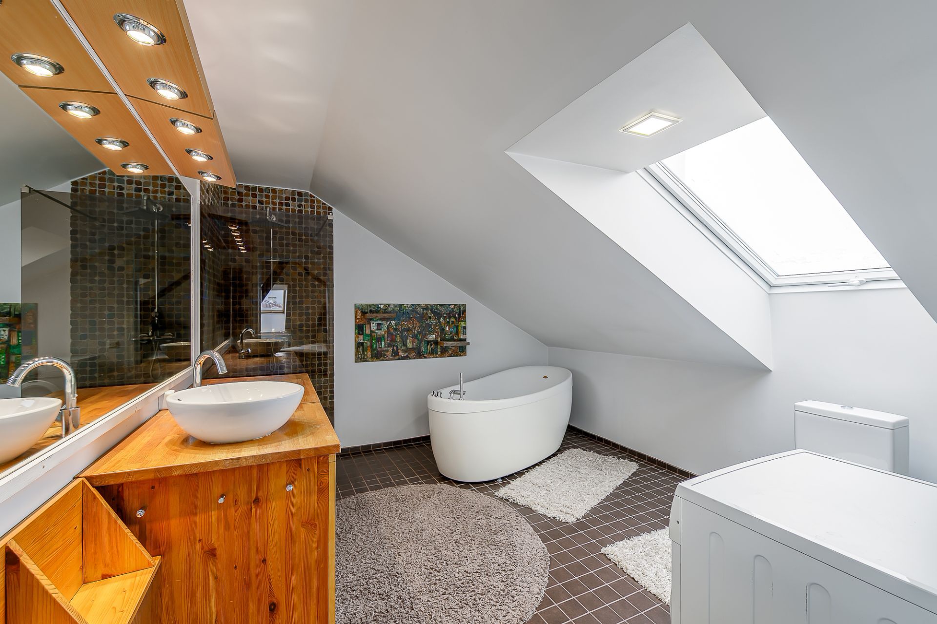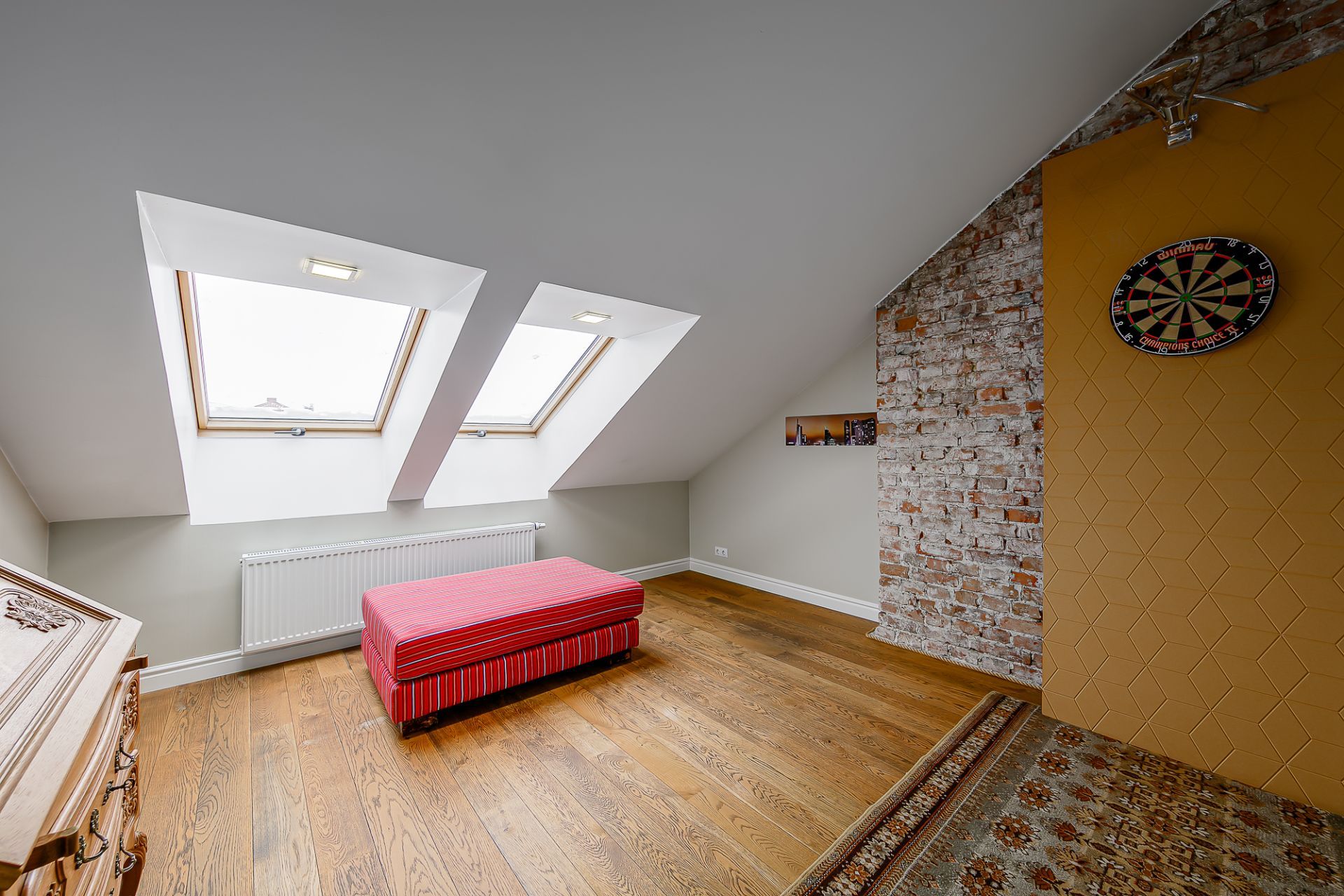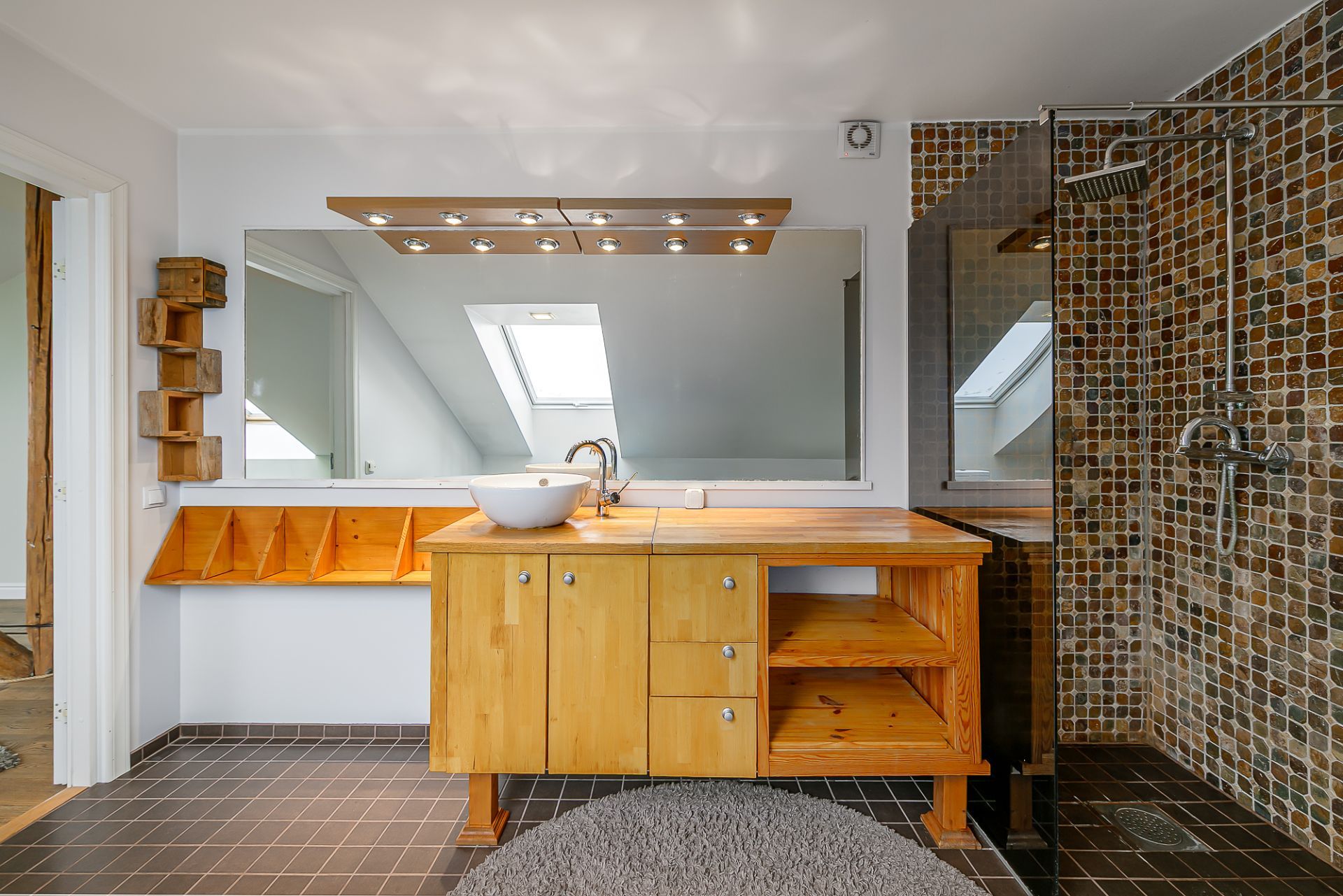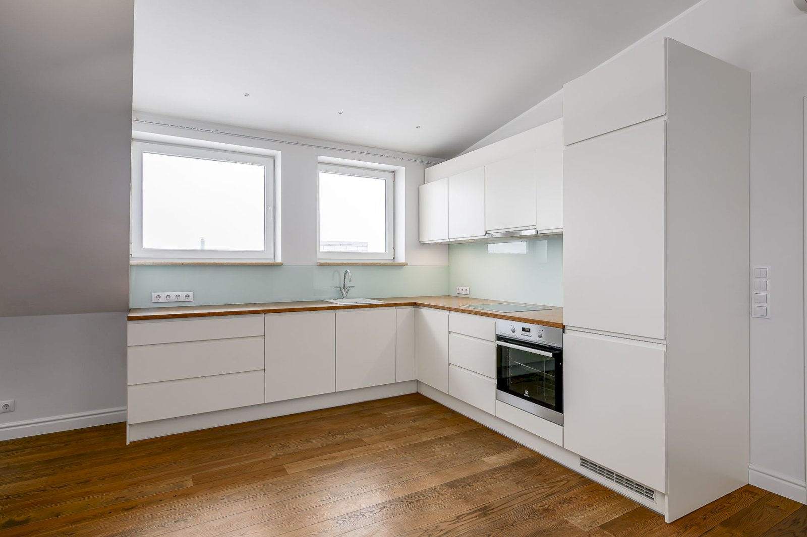 Light tones and natural materials, the wooden beams from the construction period have been preserved, which create a cozy and warm atmosphere. The floors are covered with natural parquet, natural stone in the bathroom, and granite tiles in the hallway.