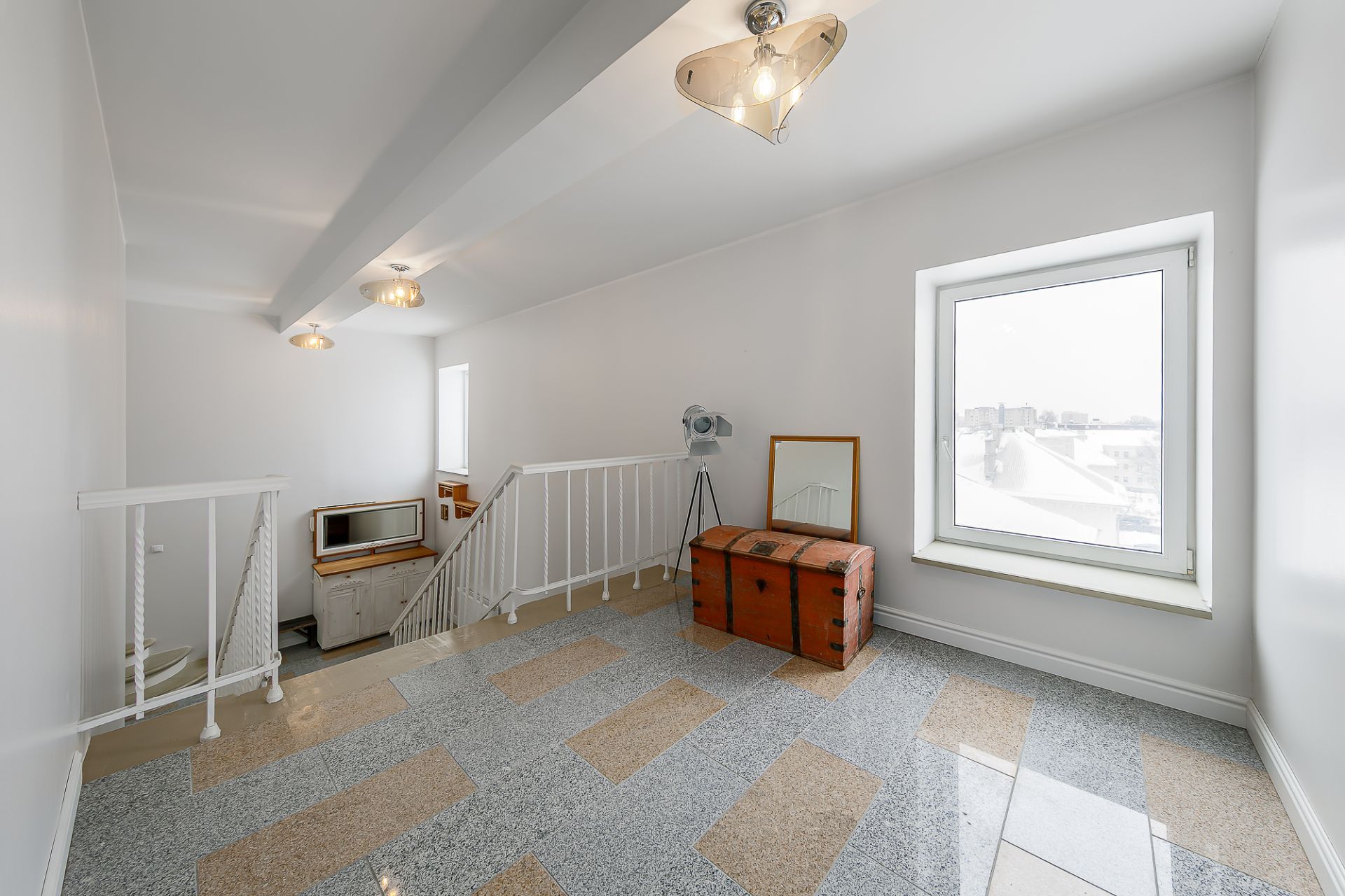 Layout: open kitchen, bright living room with fireplace (100 m2), two spacious bedrooms, unique and spacious staircase/hallway, walk-in wardrobe/storage room, two toilets and a bathroom. On the second floor of the apartment there is a tower with a 360-degree view, where a cozy seating area has been set up, which also provides access to the tower terrace.